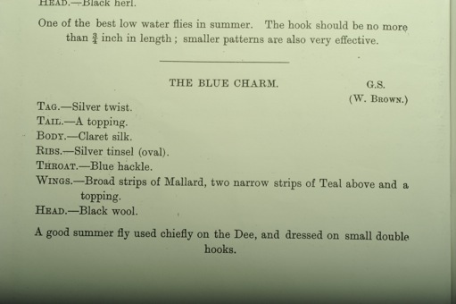 River Dee の名手 W.Brown.師の考案したさパターンThe Blue Charmを巻いてみました。 No.9で紹介した The Badger のナチュラル系の配色とこの色彩も河の状況よって使い分けるのが釣師の神髄であり使い分けの読みが当たった時の喜びこそフライフッシングの醍醐味であります。 River Deeのフライパターンは春先の派手で大きなフライからこのパターンのような極小W-Hookまで200年前には確立されており多くの先人達が試行錯誤のフィールドテストの結果、現代の我々のハートに今も強くインパクトのあるフライパターンとなっているのである。