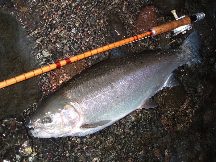 無理に魚に首を振らせない走らせない竹竿は優秀ですね。